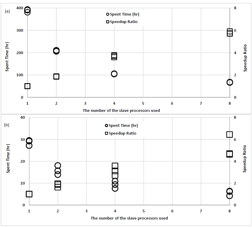Many heuristic algorithms for solving optimization problems have been proposed, and efforts have been made to improve their efficiency in finding optimal solutions. However, the sampling-based search strategies of the heuristic optimization algorithms still require considerable time to locate optima, particularly in the hyper-dimensional parameter space that are typical for distributed hydrologic models. This study evaluated the performance of parallel computing methods, ‘spmd’ and ‘parfor,’ of Matrix Laboratory (MATLAB) in improving computational efficiency of solving optimization problems using sampling-based algorithms in hydrologic and water quality modeling applications. The parallel computing methods were applied in calibrating 34 parameters for hydrologic simulation of the Soil and Water Assessment Tool (SWAT) model and in identifying watershed-scale optimum spatial distributions of corn stover removal using the AMALGAM optimization algorithm. In the applications, the SWAT model was calibrated with NSE of 0.86 and R2 of 0.93 at the watershed outlet for the calibration period of 1993 to 1999 using the parallel computing methods, and the calibrated model provided NSE of 0.84 and R2 of 0.92 for the validation period of 2000 to 2009. The results clearly demonstrated the effectiveness of the methods in reducing computational time of the parameter calibration and spatial optimization. The SWAT model code modification was not required, and changes in the source code of the original sequential optimization algorithm were minimal. Thus, the parallel computing methods of MATLAB are expected to provide simple and quick solutions for improving efficiency of solving the optimization problems in watershed model applications.